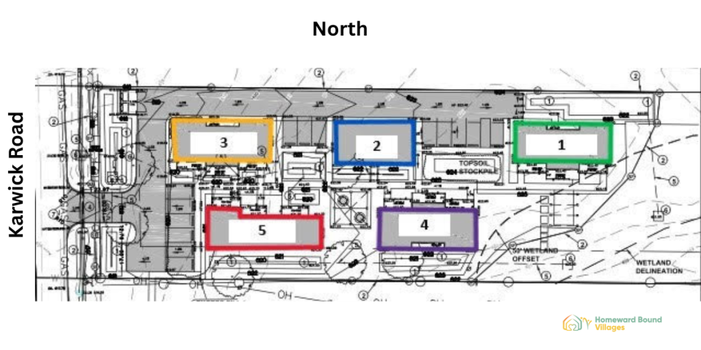 Residential Buildings #1 and #3, shown on the site plan below, are underway and fully funded. We are actively fundraising for Residential Building #4, which will house up to 6 more individuals. Residential Building #5 comes after that. The Community Building, #2, will be part of phase 2 construction.